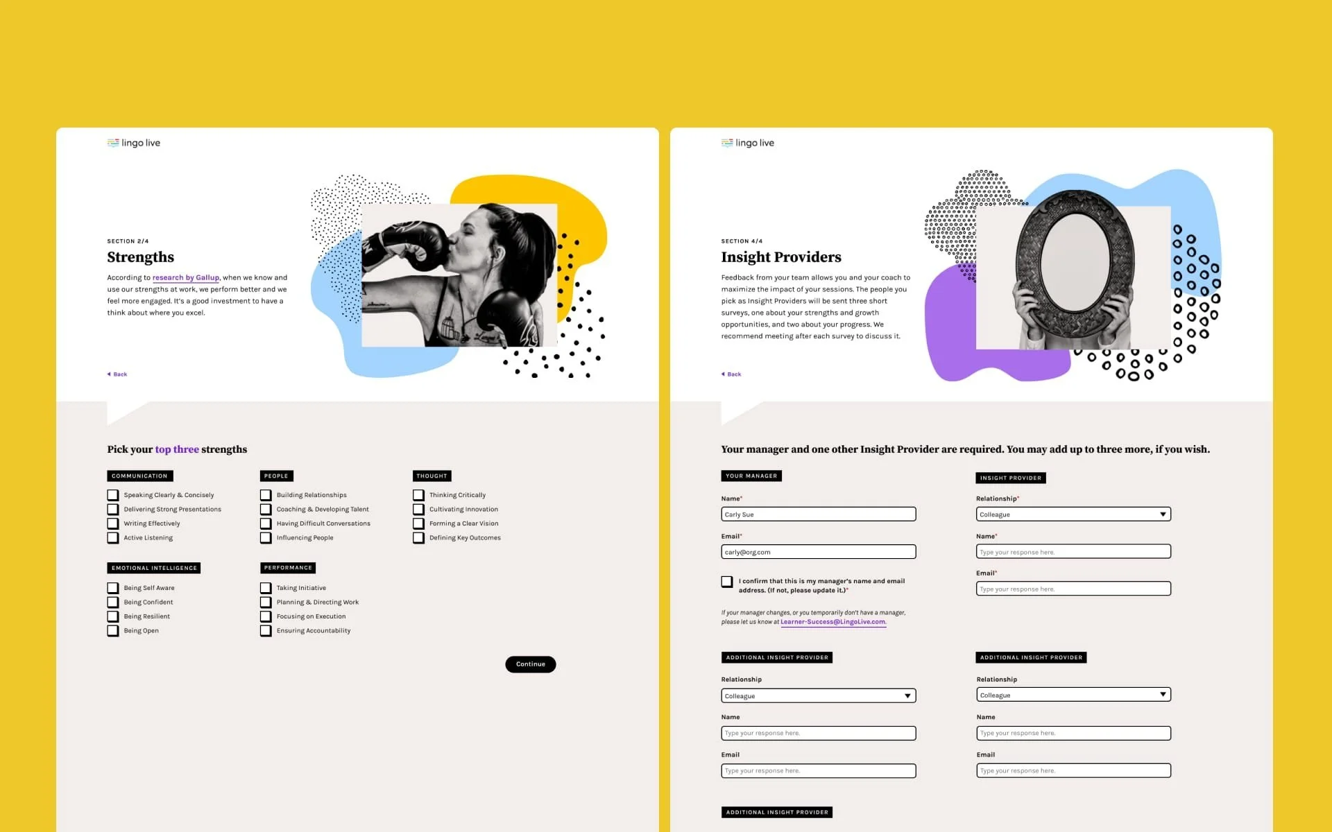 Recruit a feedback team. The last step of the onboarding survey asks the learner to provide the names and emails of their feedback team. Their manager is required to be a part of the team—clients overwhelming wanted managers involved and our research indicated it improved results.